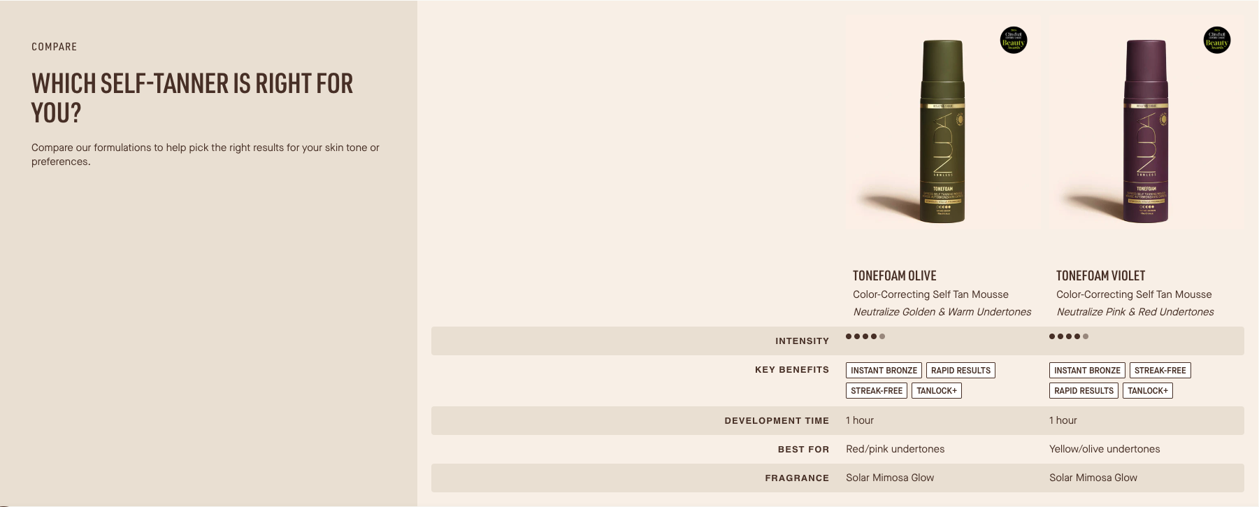 TONEFOAM Violet Express Self Tanning Mousse is our velvety, color-correcting self tanning formula designed to neutralize golden and yellow undertones for a deep, radiant tan without orange or brassy hues. Best for medium to deep skin tones with warm, yellow, or olive undertones for a rich & bronzed tropical vacation tan.